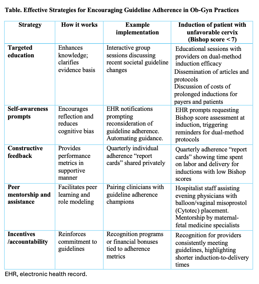 Ultimately, fostering guideline adherence in ob-gyn settings requires a nuanced and comprehensive approach, blending psychological insight, education, mentorship, and measured incentives. An example of different strategies with a real local scenario of protocol compliance challenges is presented in the table. By approaching deviations not as mere resistance but as opportunities for reflection and growth, physician leaders and clinicians can collaboratively pursue consistently excellent, evidence-based care.