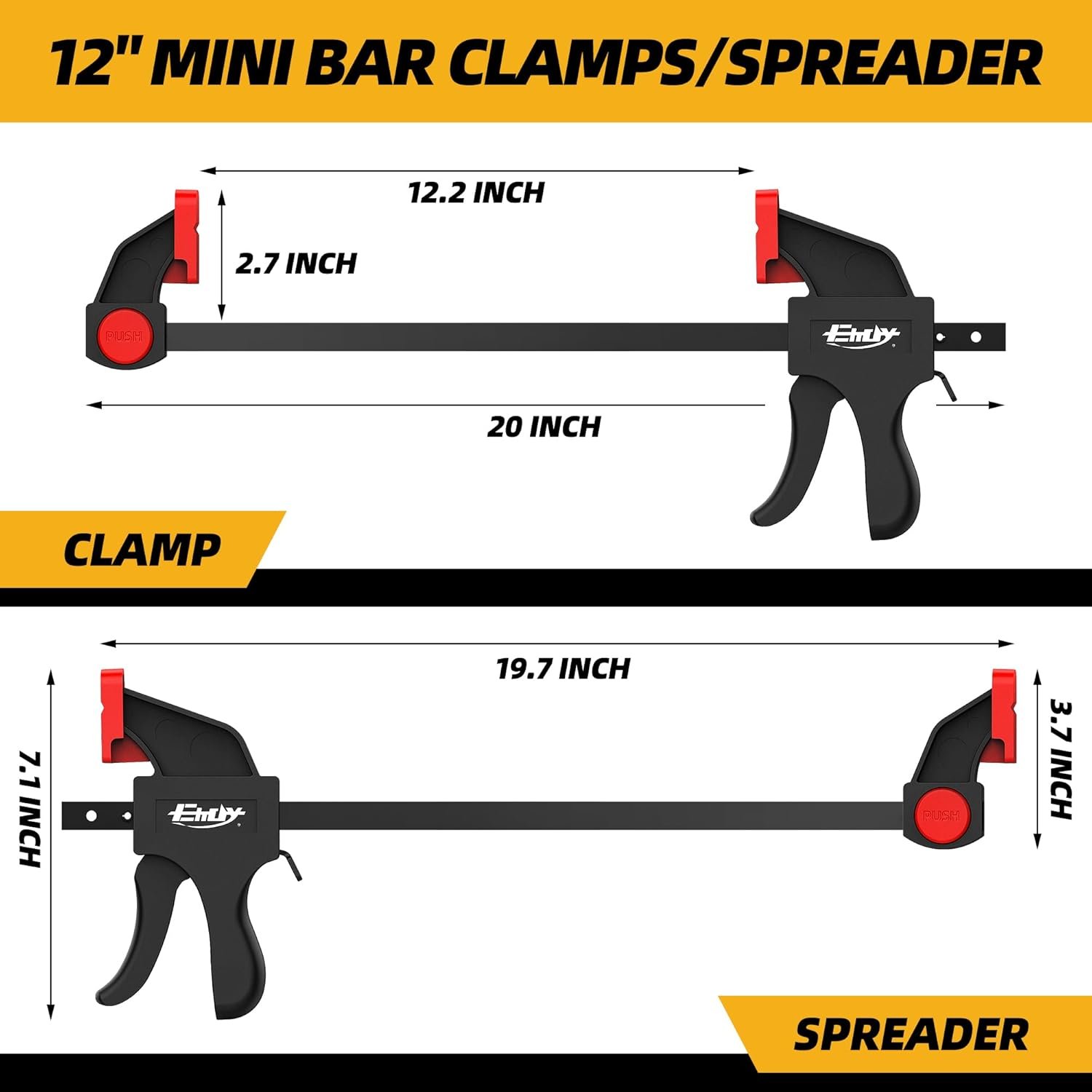 BAR CLAMPS SET: The set contains 4 pieces of 12″ bar clamps. The 12″ clamp can be set to a spreader with sizes up to 18″. A great, defined, rail construction makes sure the clamps do not slip and tighten very effectively when really putting the pressure on.