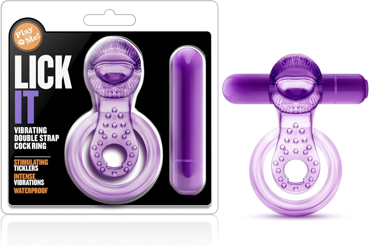 Discover intense pleasure during lovemaking with your Lick It Vibrating Cock Ring. Your C ring features a bullet vibe that emits pleasurable vibrations that will please both partners simultaneously. It’s tongue shape is also ideal for clitoral stimulation. Stretch the smaller ring around the base of the penis and the larger one behind the scrotum. Push the button to start the vibrations. Use the ring and bullet together, use just the bullet, or use just the ring. The perfect couple’s toy and the perfect solo toy as well. Made from TPE and non porous ABS Plastic. Lab Tested & Verified Body Safe. Safe With Silicone, Water Based & Hybrid Lube. Uses 1 AAA Battery. Not Included