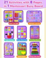 8 Pages in 1 Busy Board: Based on traditional and simple busy board, we designed this upgraded Montessori busy board with 8 pages for toddlers to explore more. Features over 20 different learning activities for toddlers to exercise, such as zippers, shoelaces, buttons, alphabet, color sorting, shape matching, counting abacus, animal puzzles, carrot game, making cake game, etc.
