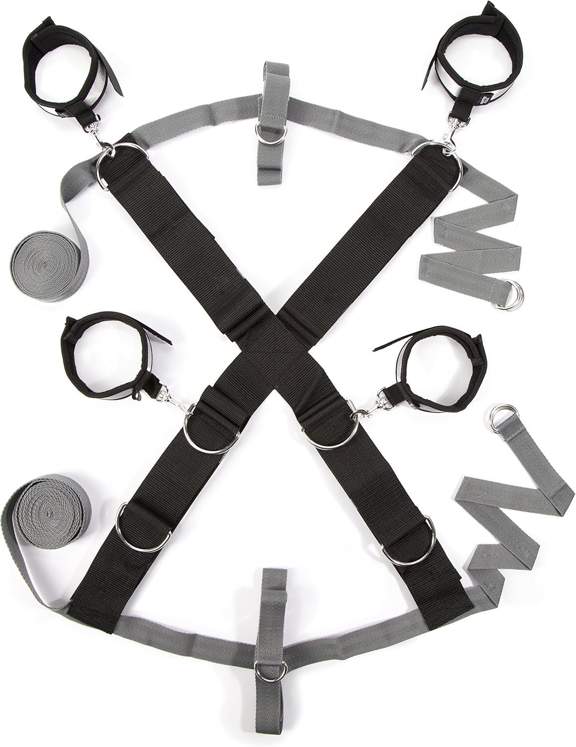 The restraint is easy to set up and requires no tools for assembly, just a double bed of any size. Place the black straps in a diagonal cross on top of your mattress with the wrist and ankle cuffs at each corner. Feed the thin grey straps around the head and foot of your mattress, taking care to ensure the 2 D-rings remain on top. Feed the straps through the D-rings and tighten.