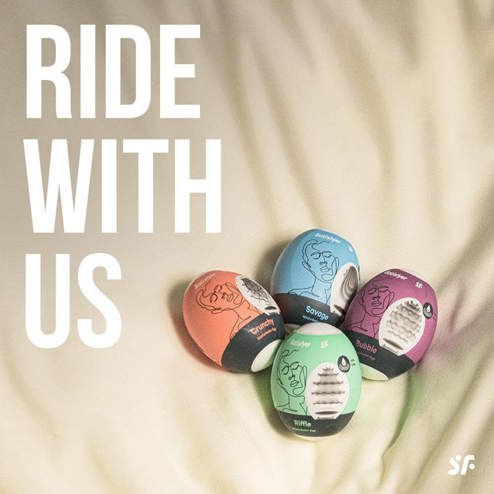 What came first, the chicken or the egg? It’s with a lot of eggcitement that we can officially give you the answer to this legendary question and introduce you to the masturbator eggs from Satisfyer. With their supple softness, they make every lance, no matter how hard, melt away! Thanks to the flexible material, the Satisfyer masturbator eggs are extremely stretchy and stimulate the entire penis. The hydroactive TPE can also be moistened easily with water, ensuring a smooth experience – so you don’t need any lubricant gel. Perfect for on the go, when traveling or in between! The eggs entice you with their different textures: Enjoy stimulating nub textures with Bubble and Naughty. With their groove and spiral texture, Riffle, Fierce and Savage ensure your big guy will enjoy absolute happiness. Crunchy completes the set with its abstract ribbed texture.