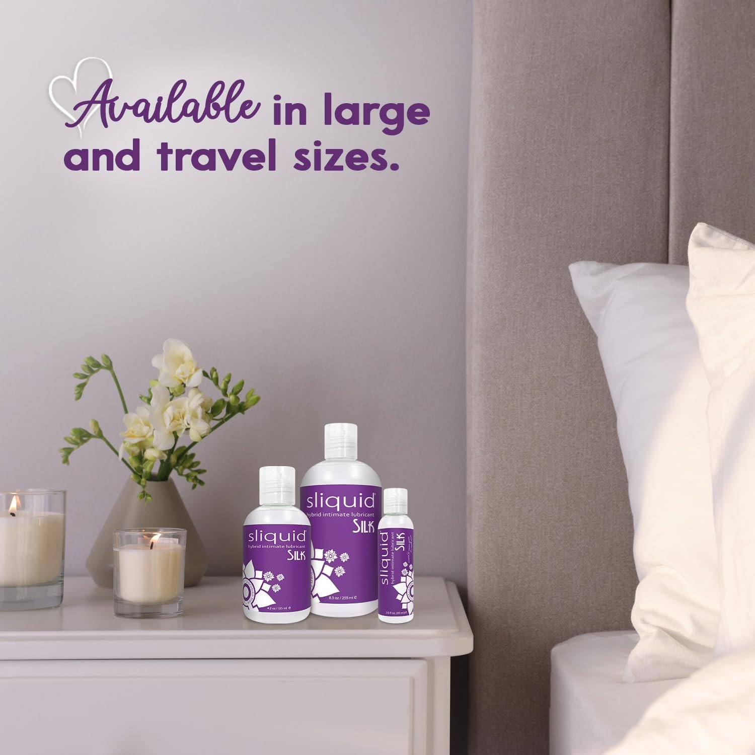 Sliquid Silk is available in three versatile bottle sizes; purchase bottles for home and some for travel.