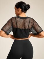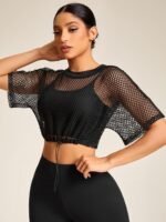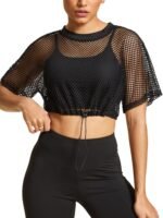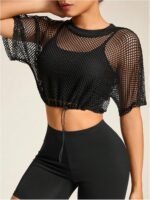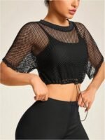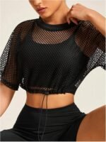 Verdusa Women’s Drawstring Hem Cropped Fishnet T Shirts Sports See Through Crop Tops